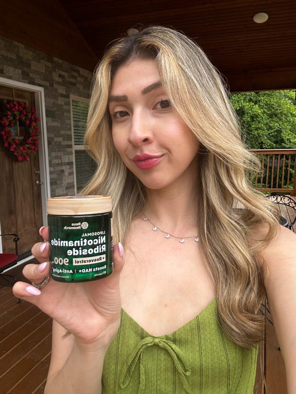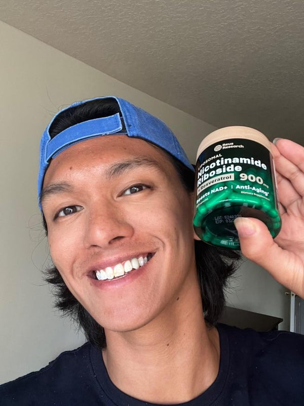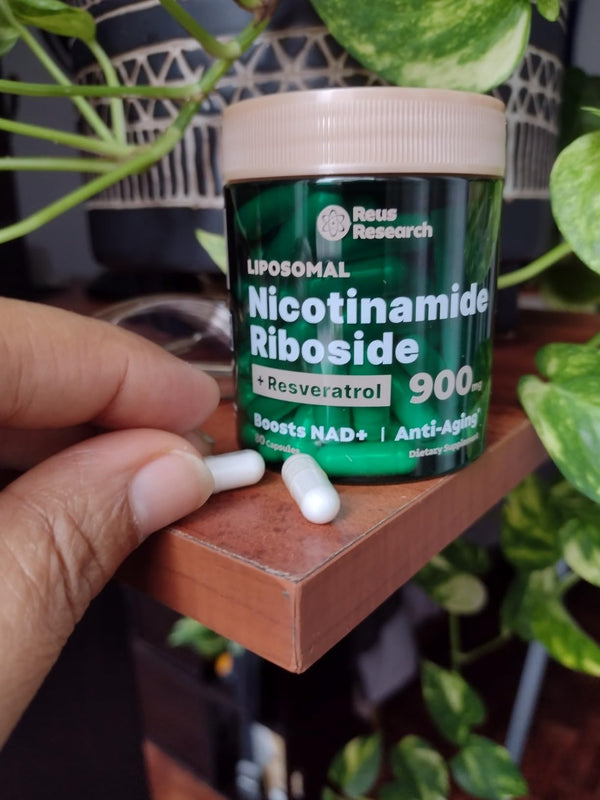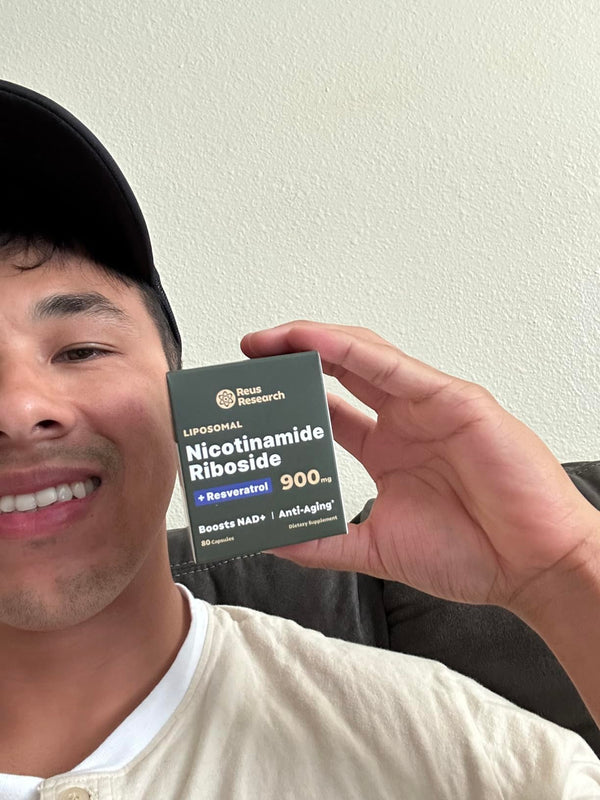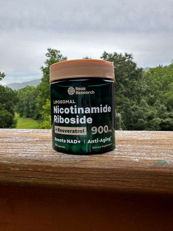 Reus Research NR900 is an all-in-one anti-aging NAD+ supplement designed to support skin aging, enhance energy levels, and boost focus. It contains Nicotinamide Riboside, Resveratrol, and Quercetin, delivered through advanced liposomal technology for superior absorption.